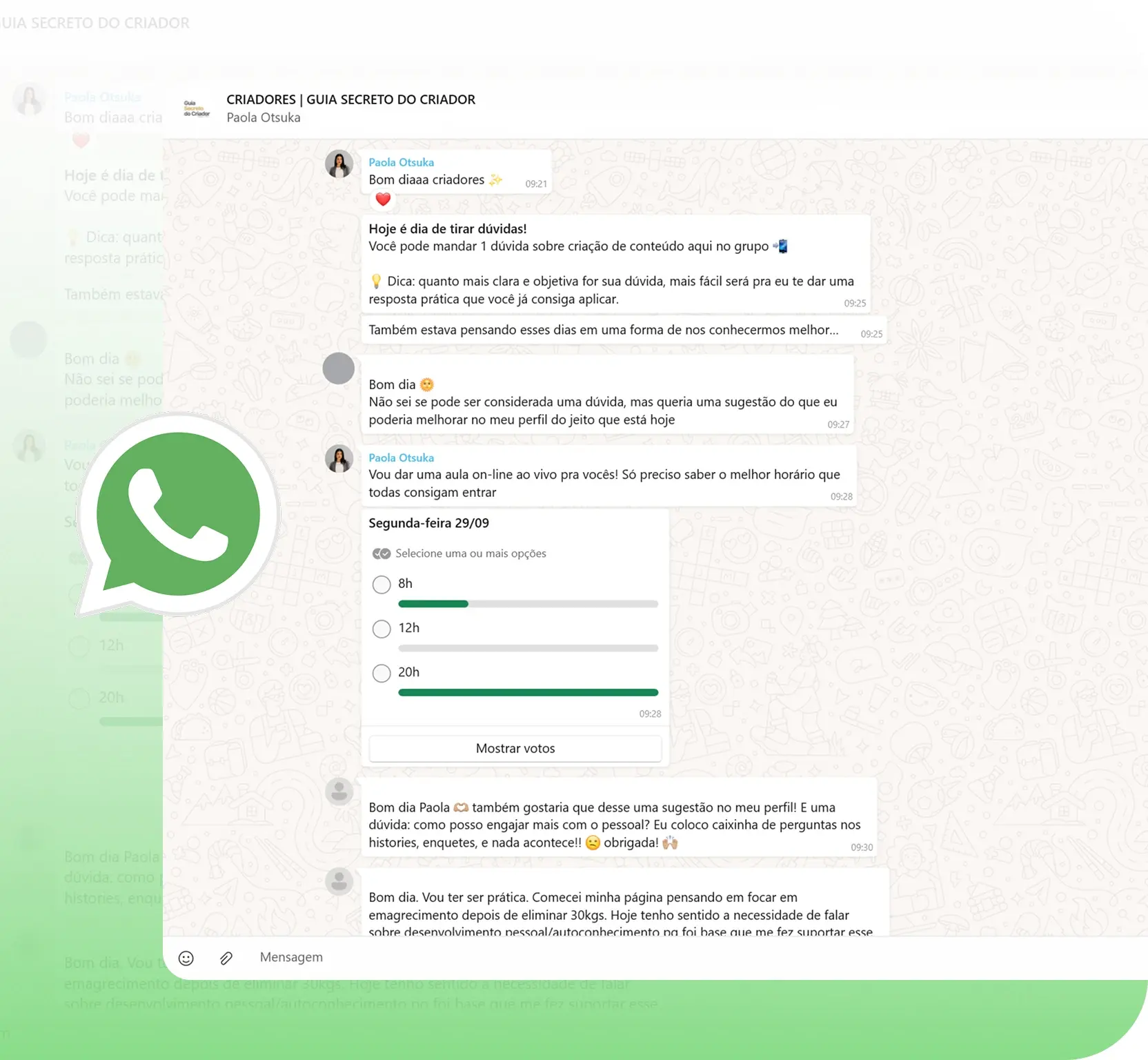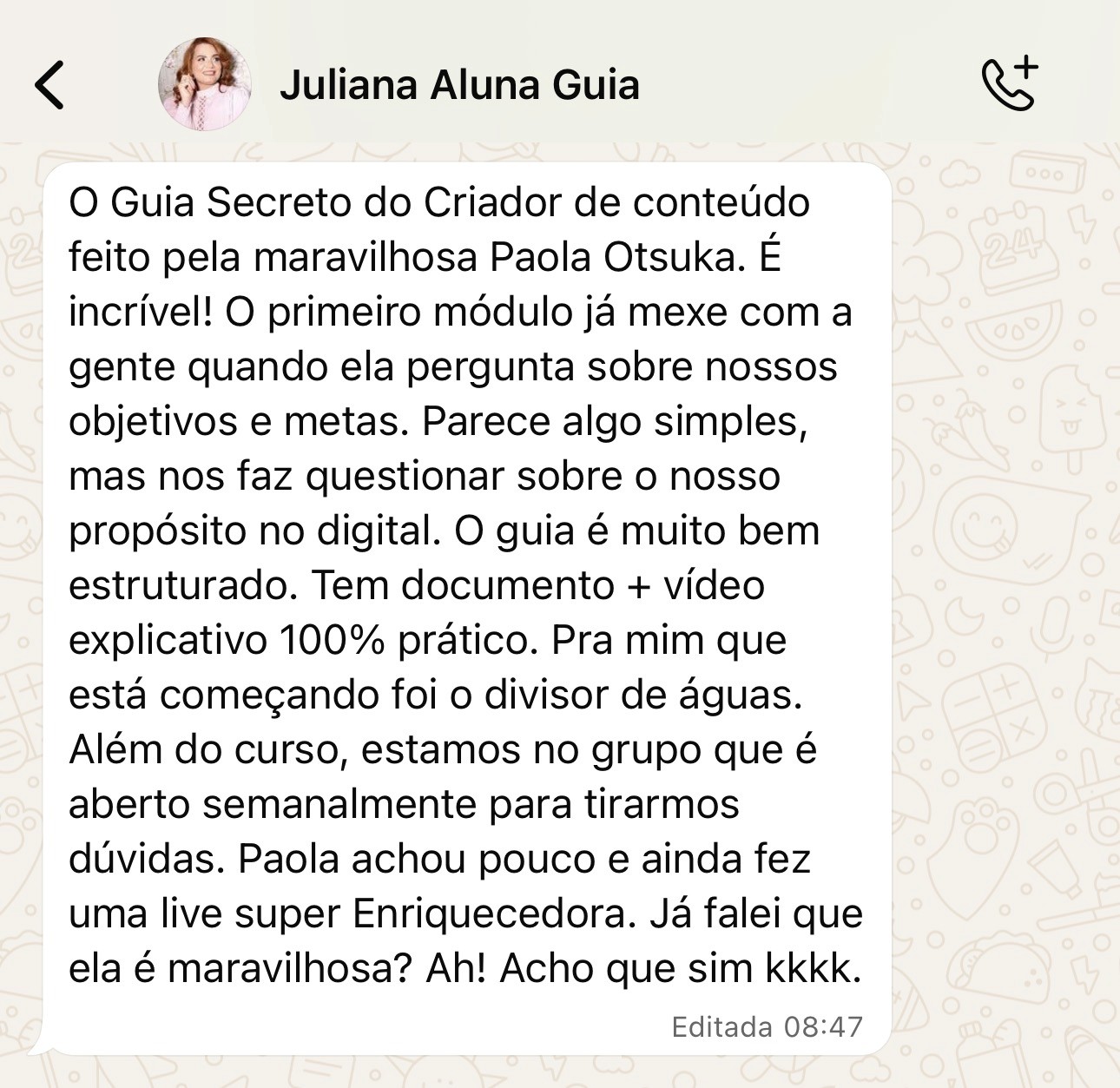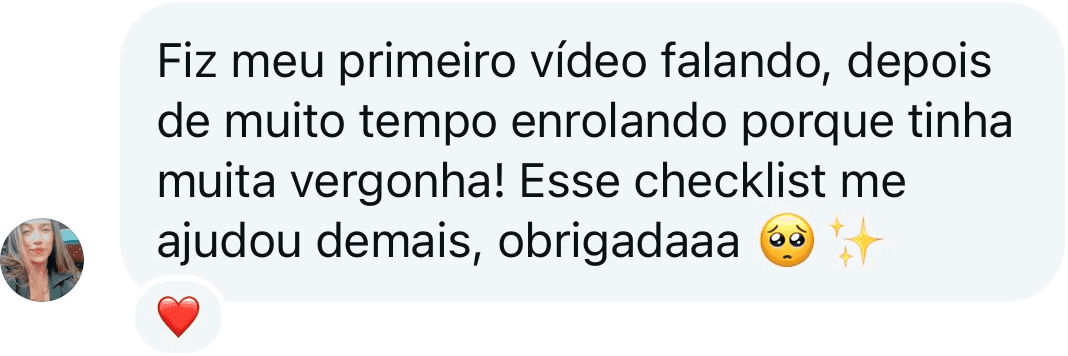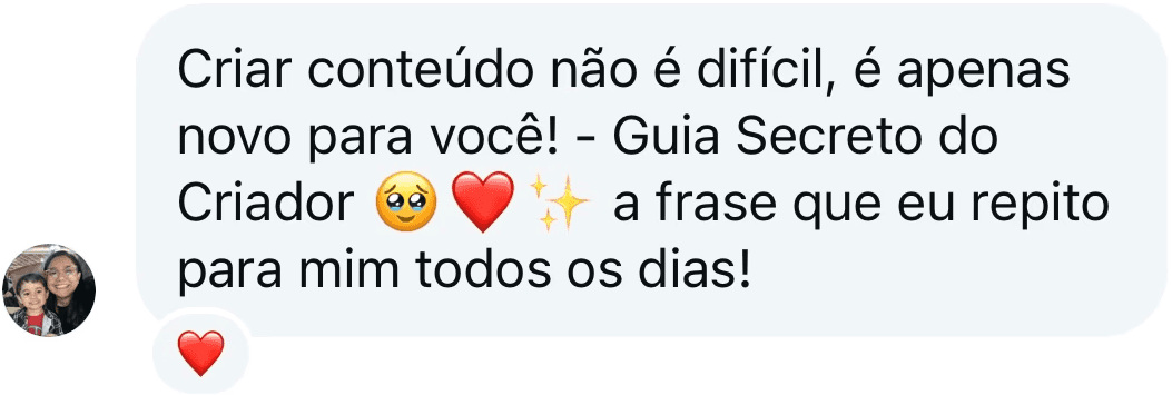 Além do guia, você entra em um grupo exclusivo no WhatsApp com outros criadores iniciantes. E o melhor, toda semana eu entro lá pra tirar dúvidas e te lembrar que você é capaz, mesmo nos dias difíceis.