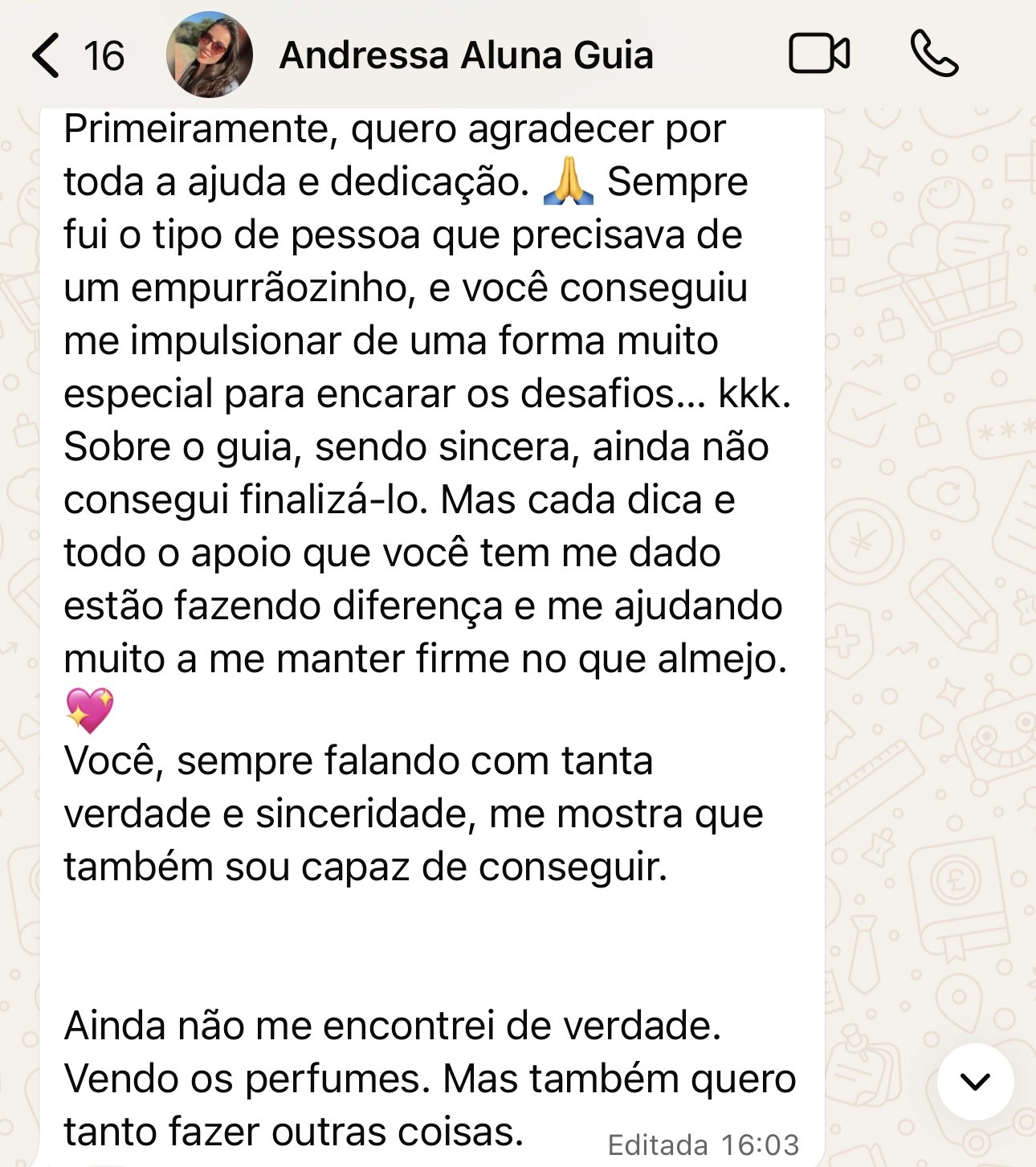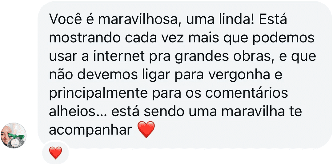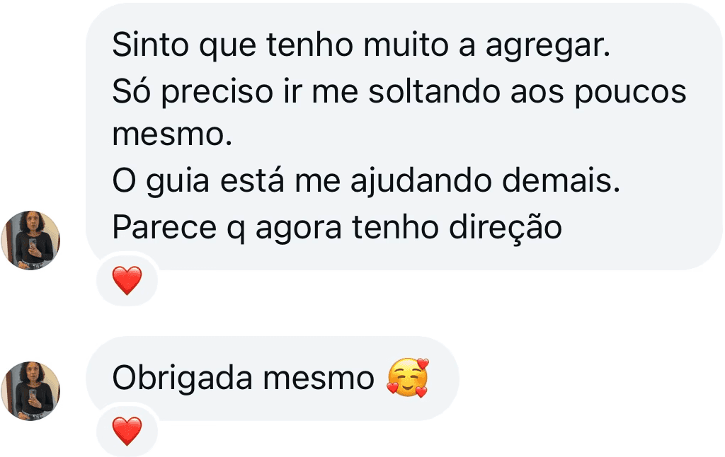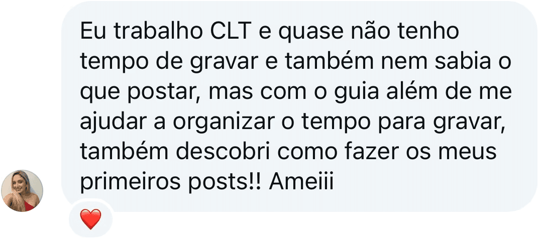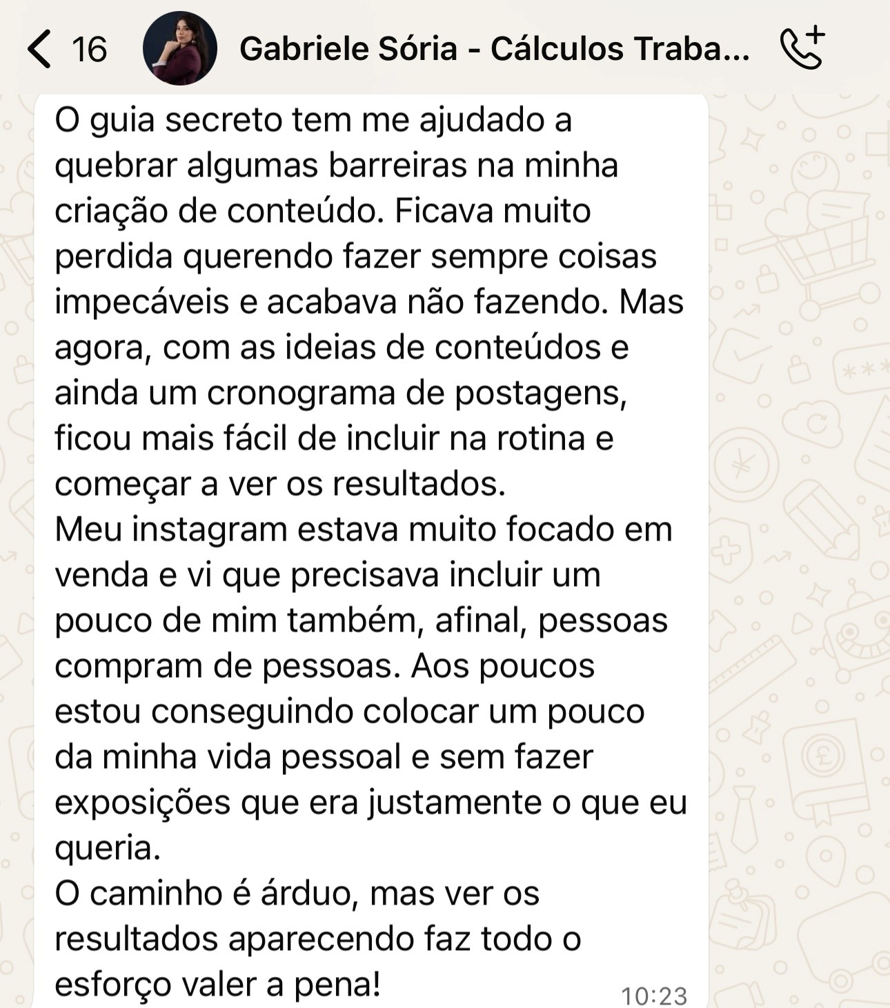 Além do guia, você entra em um grupo exclusivo no WhatsApp com outros criadores iniciantes. E o melhor, toda semana eu entro lá pra tirar dúvidas e te lembrar que você é capaz, mesmo nos dias difíceis.