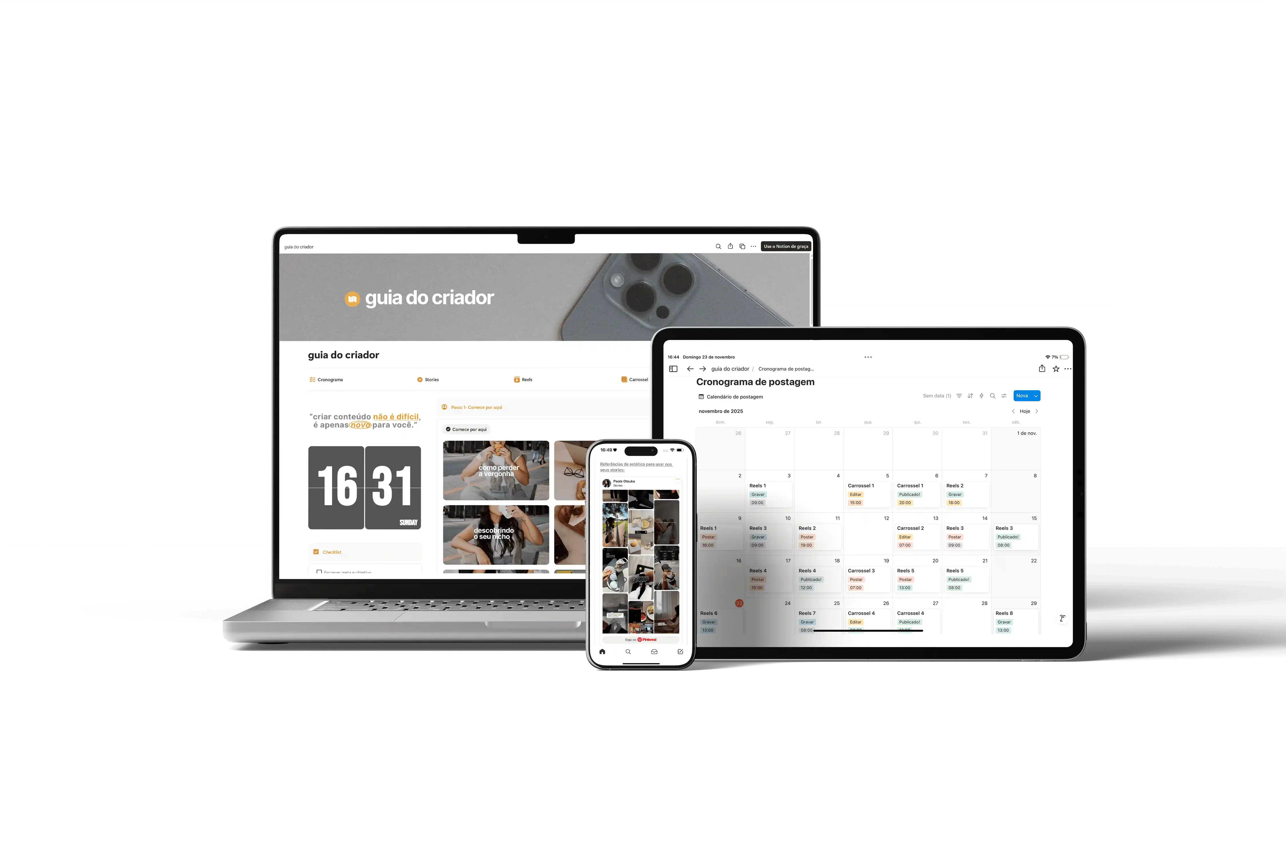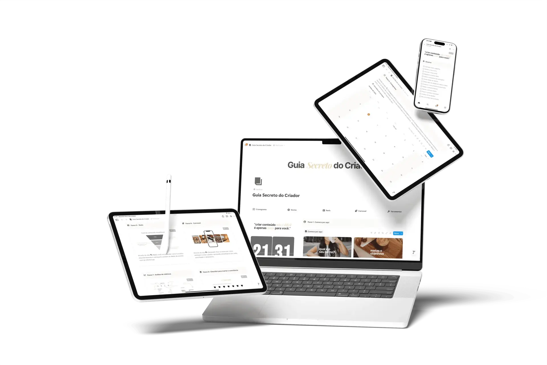 Não é um curso tradicional com horas de vídeo. O Guia é um material prático e organizado dentro do Notion, com explicações escritas, exercícios, orientações estratégicas e vídeos de apoio pra te ajudar ainda mais. É direto, sem enrolação, e você aprende no seu ritmo.